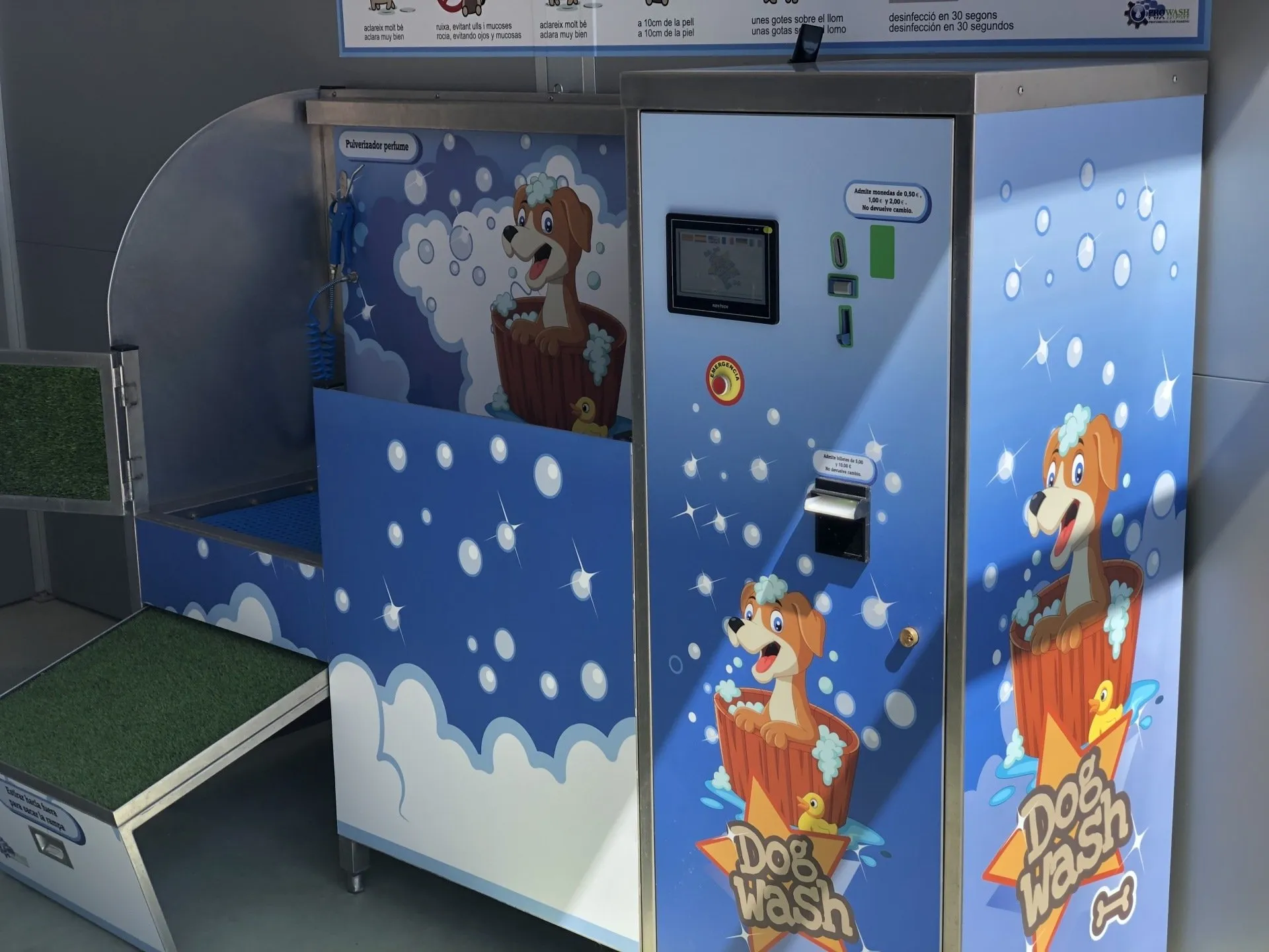 Los equipos son completamente automáticos y auto gestionables por el usuario final. Incluyen pantalla táctil, sistemas de seguridad, dispensadores de champú, suavizante y antiparasitario, y secado integrado.
